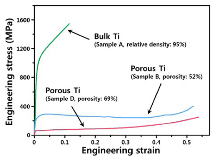 영률을 측정하였다. 시편 A의 상대 밀도는 95%이며, 시편 B와 D로부터 측정한 기공률은 각각 52와 69%이다 (표 3). 그림 6은 세 가지 시편에 대하여 측정한 압축시험 결과이다. 시편 A는 936 MPa에서 항복되었으며, 영률은 113 GPa로서 문헌에 보고된 Ti의 영률(120.2