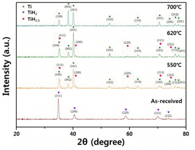 다. 550 °C와 620 °C에서 열처리한 분말에서는 준안정상인 TiH1.5 상이 존재하였으나 700 °C에서 열처리한 분말에서는 탈수소화가 완전히 종료된 Ti 단상의 피크가 관찰되었다.