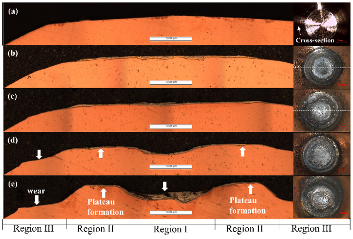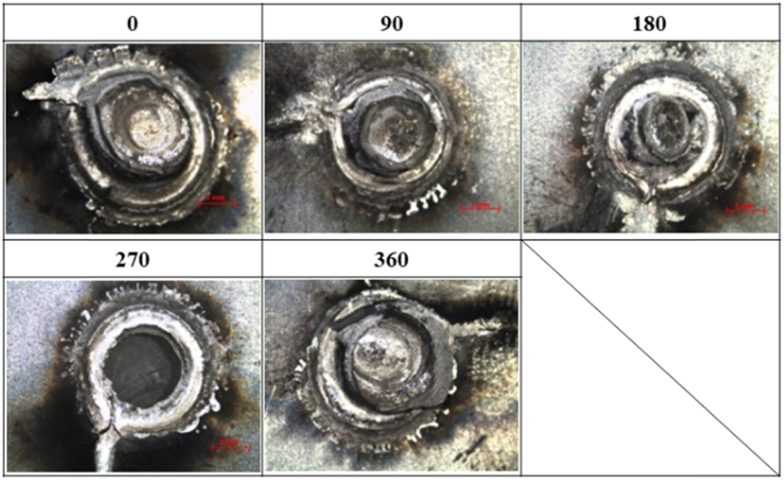 (a) as-received; (b) 90th weld; (c) 180th weld; (d) 270th weld; (e) 360th weld.