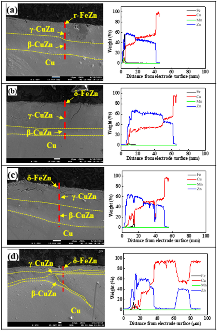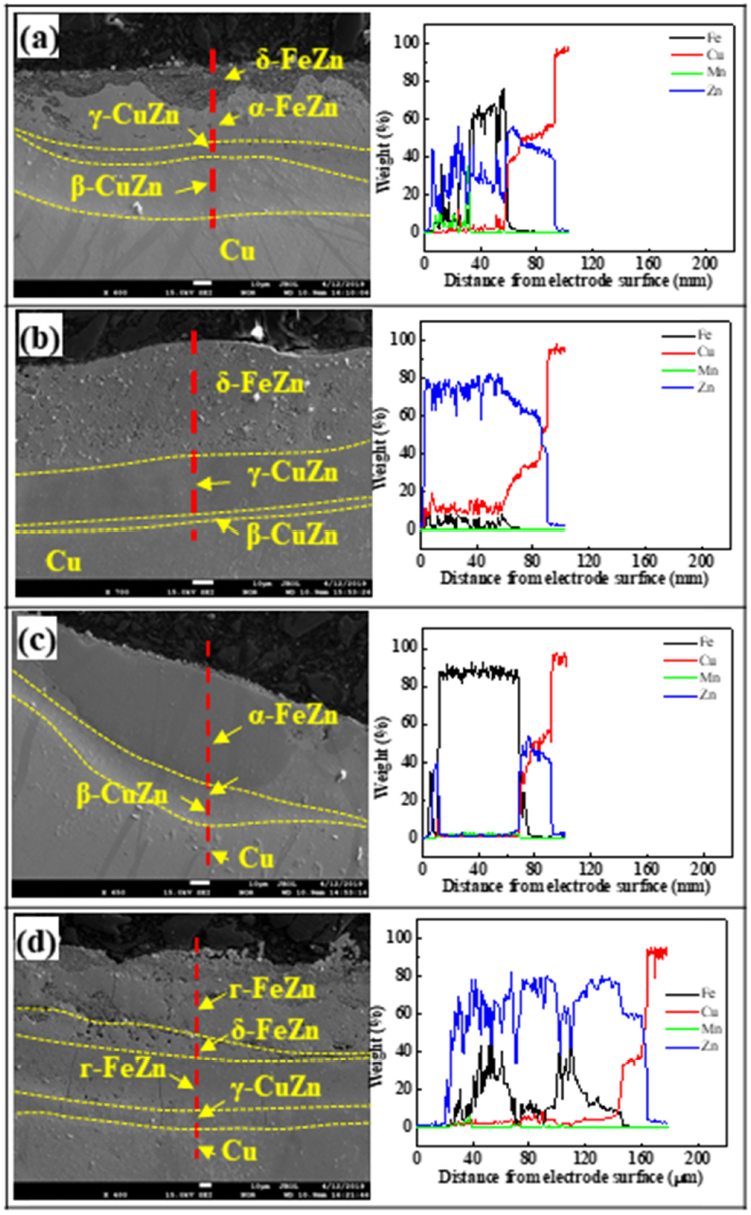 ํนํ, ์์ฐ ๋๊ธ ๊ฐํ์ ๊ฒฝ์ฐ ๋น๋๊ธ ๊ฐํ๊ณผ๋ ๋ฌ๋ฆฌ Zn ๋๊ธ์ธต๊ณผ ๋ํฉ๊ธ ์ ๊ทน ์ฌ์ด์์ ํฉ๊ธ์ฑ๋ถ์ ์ํธํ์ฐ์ด ์ง์์ ์ผ๋ก ๋ฐ์ํจ์ ๋ฐ๋ผ ์ ๊ทน ์ ๋จ๊ฒฝ์