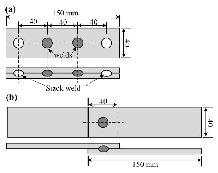 Schematics of (a) welding specimen and (b) tensile-shear test specimens.
