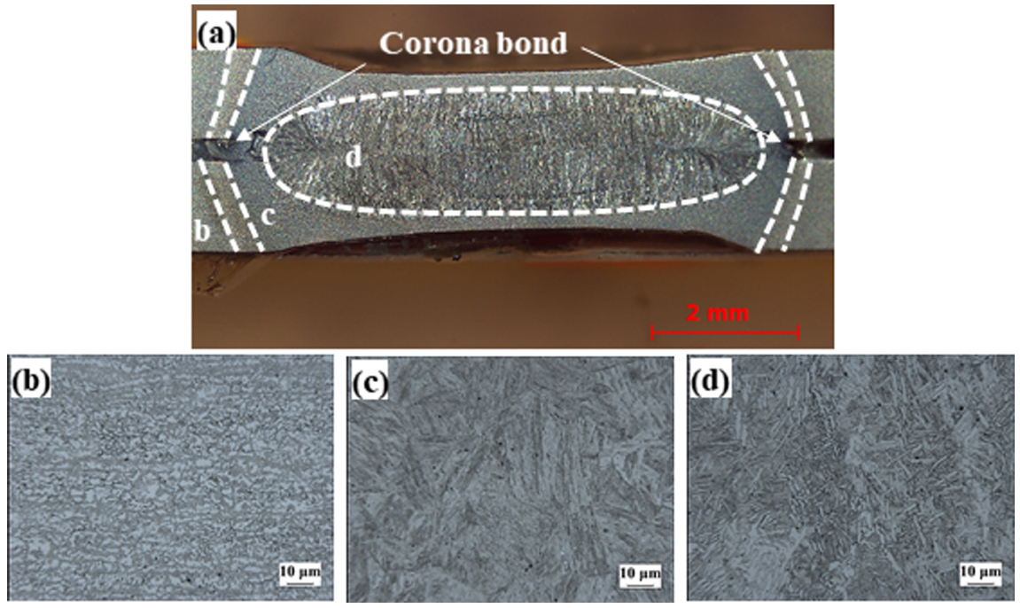steel. (a) weld nugget where the location of micrographs; (b) base metal; (c) HAZ;