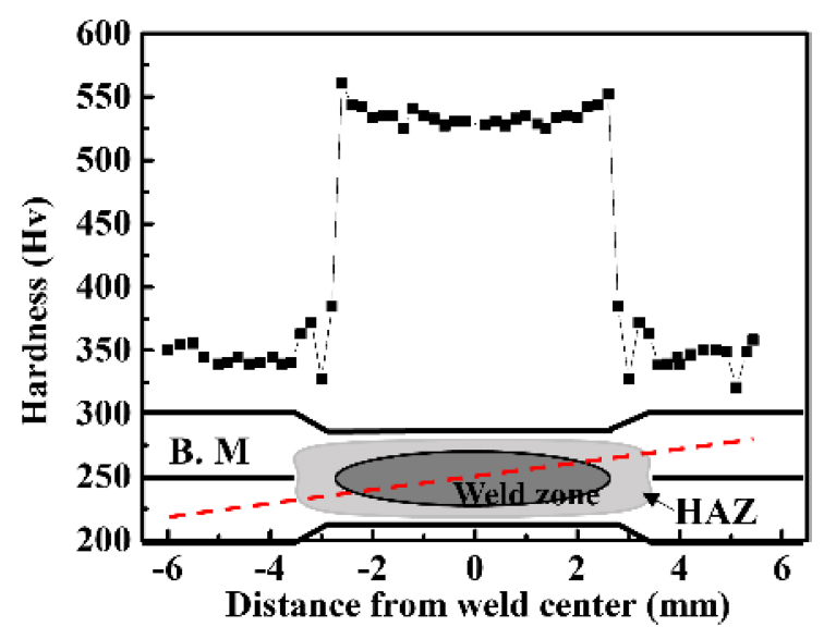 Hardness distributions of GA 1180TRIP steel after RSW with 8kA, 4kN and 18cycles.