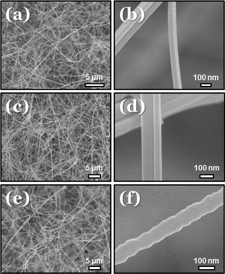 are presented in Fig 1 (a)-(f). Fig 1(a) reveals bare, curvy, and continuous SnO2 nanowires with lengths in the order of several micrometers and diameters of ~100