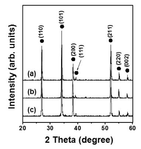 and Si-coated SnO2 nanowires were recorded and are shown in Fig 2(a)-(c). Common peaks for all materials were observed at 2θ = 26.61, 33.92, 37.99, 39.02,