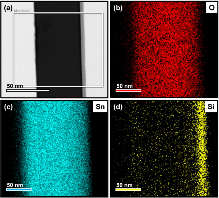 in the synthesized nanowires are shown in Fig 4. It is noteworthy that a thin Si layer covered the SnO2 nanowires.