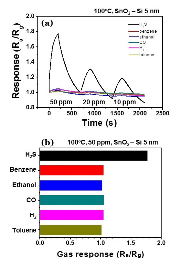 To study the selectivity of 5 nm-thick Si shell-coated SnO2 nanowires, they were exposed to 50 ppm of benzene, ethanol, CO, H2, and toluene gases at 100 °C. Fig 6(a) shows the variations in responses to these gases with time; the corresponding selectivity