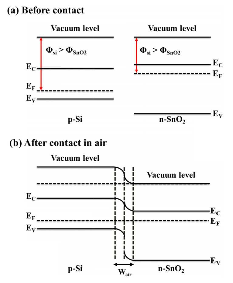 level (EF) of p-Si is lower than that of SnO2 (Fig 8(a)). In this case, the work function of SnO2 will be smaller than that of p-Si. Thus, electrons from SnO2 will flow to p-Si (Fig 8(b)). Consequently, electron and hole depletion layers will be generated on the SnO2 and p-Si sides of the heterojunction, respectively. Subsequently, the initial conduction