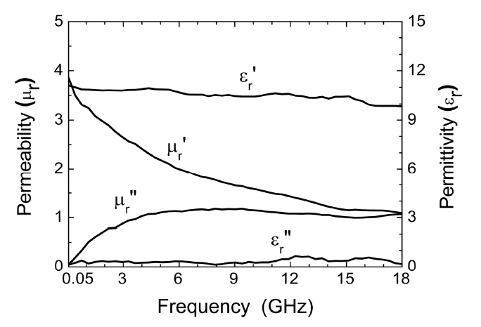 )은 주파수에 따라 크게 증가하여 6 GHz 이상에서 약 1.2의 일정한 값을 보인다. 이에 따라, 자기손실계수 (tanδμ)는 1 GHz 미만의 주파수 대역에서 0.1 미만으로 작은 값을 보이고, 점차 증가하여 18 GHz 근처에서 최대 1.0의 값을 보인다.