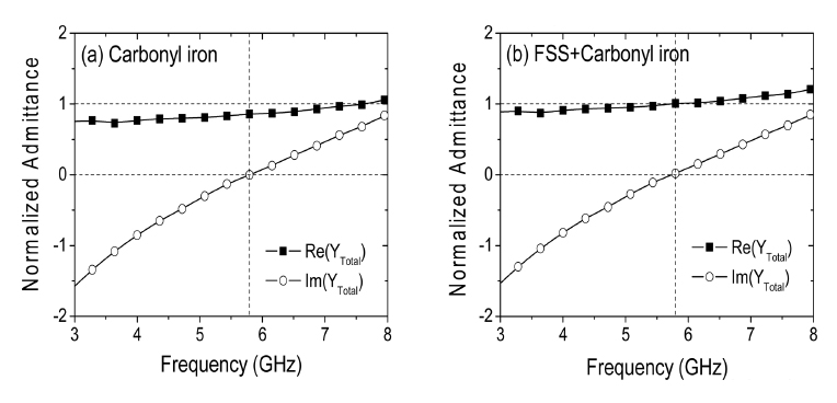 카보닐 철 분말 복합재를 기판으로 사용한 경우에 FSS 부착에 따른 전파흡수능의 개선을 어드미턴스 분석을 통하여 분석하였다. 그림 6은 FSS 부착 전, 후에 자유공간의 어드미턴스 (Y0)로 규격화시킨 합성 어드미턴스 (Y) 분석 결과를 보여준다. 카보닐 철 분말 복합재의 경우 (그림 6(a)), 허수부는 5.8 GHz까지 음의 값 (인덕턴스 성분)을 갖고, 5.8 GHz 이상에서는 양의 값 (커패시턴스 성분)을 나타내고 있다. 실수부는