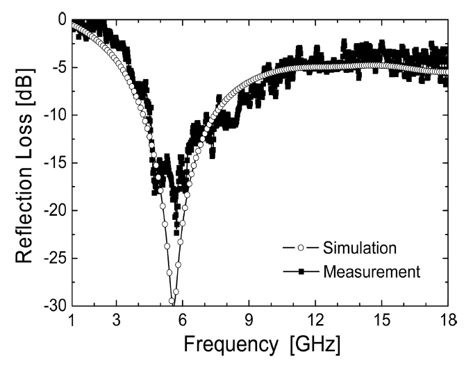 그림 8은 카보닐 철 분말 복합재 (두께 = 2.5 mm) 표면에 Rs = 200 Ω/sq인 SL-FSS를 부착한 시편에서 측정한 반사손실 결과이다. 5.8 GHz에서 –24 dB의 반사손실을 보이고, 시뮬레이션 결과와도