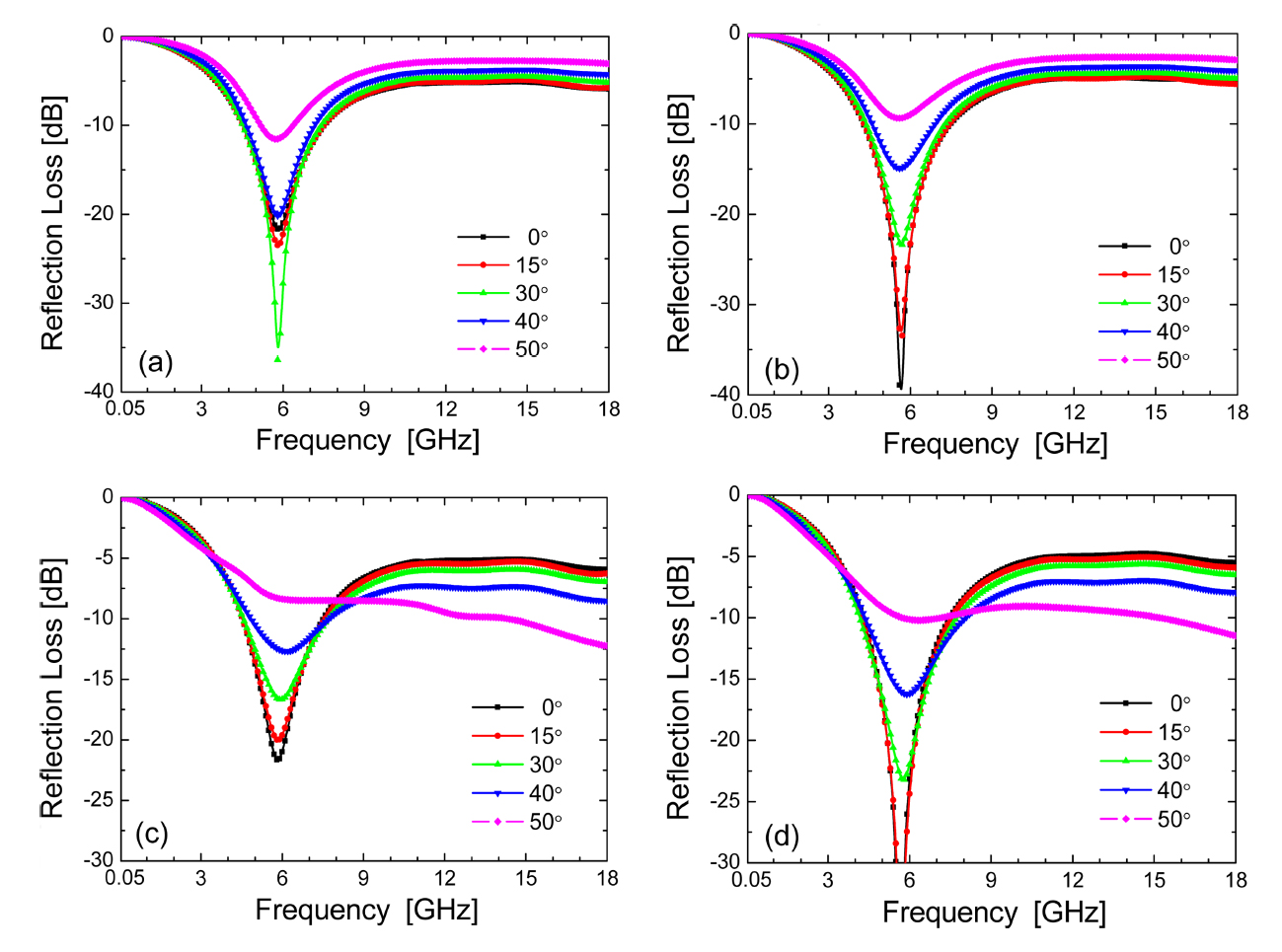 카보닐 철 분말 복합재 (두께 = 2.5 mm)에 SL-FSS (Rs = 200 Ω/sq)를 부착시킨 시편에서 입사각 0~60° 범위에서의 경사입사 특성을 분석하였다. 그림 9는 FSS 부착 전, 후의 transverse electric (TE), transverse magnetic (TM) 편파에서 시뮬레이션 한 경사입사