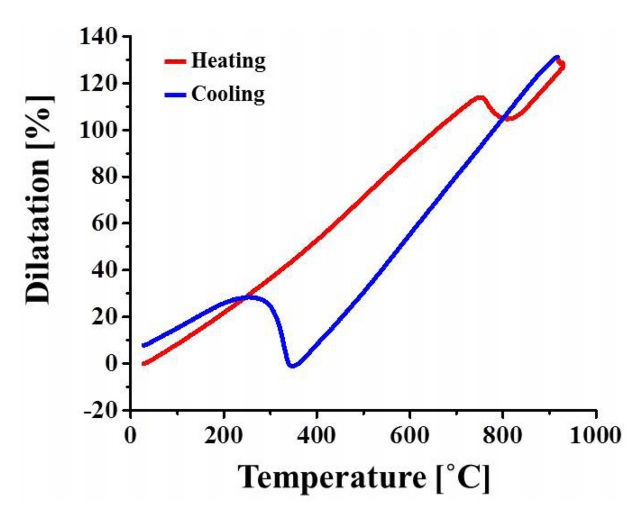 ๋ํ๋๊ฒ ๋๋ค. Austenite์ ๋ถ์จ์ด ์ฆ๊ฐํจ์ ๋ฐ๋ผ ํฝ์ฐฝ๋ฅ ์ ๊ฐ์ํ๋ค๊ฐ 810 oC์์ ๋ณํ๊ฐ ์๋ฃ๋์ด Austenite ๋จ์์ด ๋๋ฉด ๋ค์ ์จ๋์ ์ํ ํฝ์ฐฝ์ผ๋ก ํฝ์ฐฝ๋ฅ ์ ์ฆ๊ฐํ๋ค. Austenite ๋จ์๊ตฌ์กฐ์ ์ํธ์ -50 oC/s์ ๋๊ฐ์๋๋ก ๊ธ๋ญํ๊ฒ ๋๋ฉด 250 oC ๋ถ๊ทผ์์ Open structure์ธ Body Centred Tetragonal (BCT) ๊ตฌ์กฐ์ Martensite ์์ด ์์ฑ๋๋ฉด์ ํฝ์ฐฝ๋ฅ ์