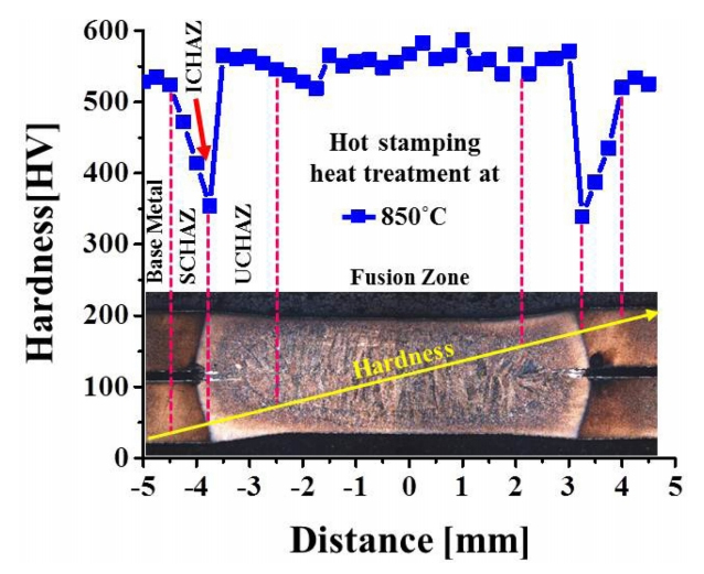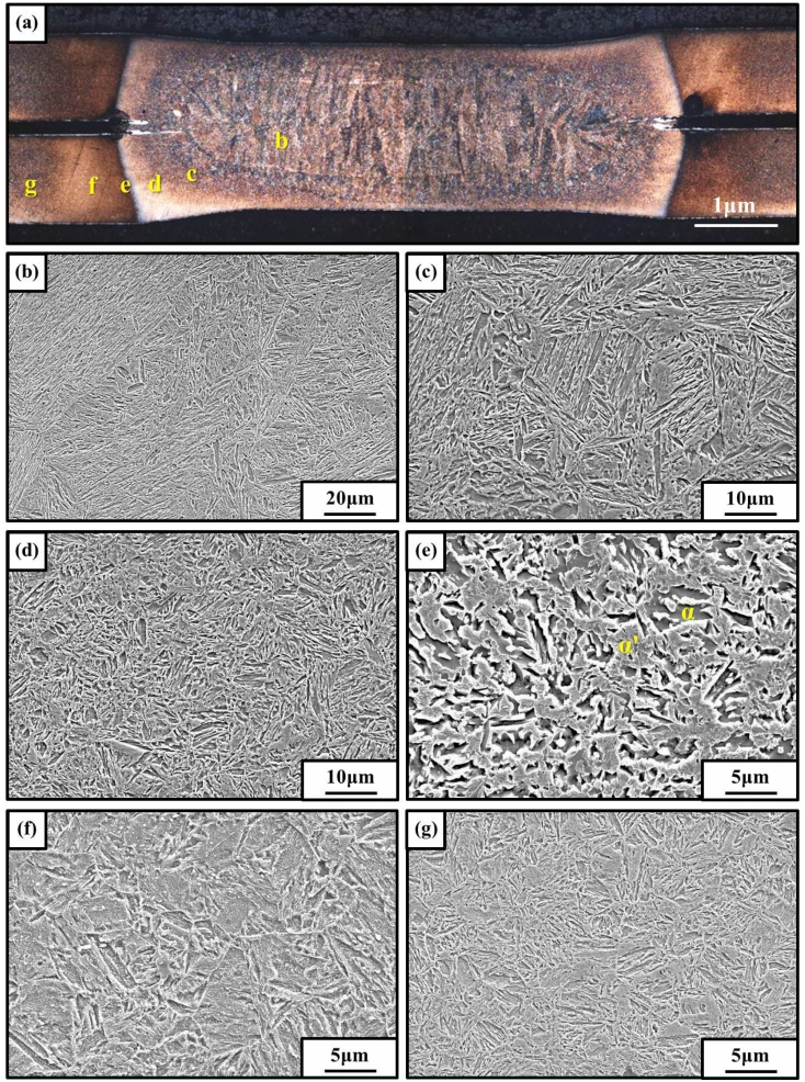 ๊ทธ๋ฆผ 3์ 850 oC ์ด์ฒ๋ฆฌ ์ํธ์ ์ฉ์ ๋ถ ๋ฏธ์ธ์กฐ์ง์ ๋ํ๋ธ ๊ฒ์ด๋ค. ์ ์ฉ์ ์ ์ต๋ ๋๊ฒ๊ฒฝ์ ๊ฐ์ง๋ 6.5 kA ์ ๋ฅ์กฐ๊ฑด์์ ์ค์ํ์๋ค. ๊ทธ๋ฆผ 3(a)์์ ์ฉ์ ๋ถ๋ (b) ์ ์ฉ์ ์ ์ฉ์ต๋์๋ค๊ฐ ์๊ณ ๋๋ Fusion Zone (FZ), (c-f) ์ฉ์ต๋์ง ์์ง๋ง ์ ์ฉ์ ์ ๋ฐ์ํ๋ ์ด๋ก ์ธํ์ฌ ๋ฏธ์ธ์กฐ์ง์ ๋ณํ๊ฐ ์๊ธฐ๋ Heat Affected Zone (HAZ), (g) ์ด์ํฅ์ ๋ฐ์ง ์์ Base Metal (BM)์ ์ธ๊ฐ์ง ์์ญ์ผ๋ก ๋๋ ์ ์๋ค. ์ด์ค HAZ๋ ์จ๋์์ญ์ ๋ฐ๋ผ (b-c) Ac3์จ๋ ์์์ ์ด์ฒ๋ฆฌ๊ฐ ๋๋ Upper-Critical HAZ (UCHAZ), (d) Ac1-Ac3์จ๋ ์ฌ์ด์ ์ด์์์ญ์์ ์ด์ฒ๋ฆฌ๊ฐ ๋๋ Inter-Critical HAZ (ICHAZ), Ac1์จ๋ ๋ฐ์์ ์ด์ฒ๋ฆฌ ๋๋ Sub-Critical HAZ (SCHAZ)๋ก ๋๋๋ค [15].