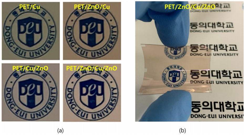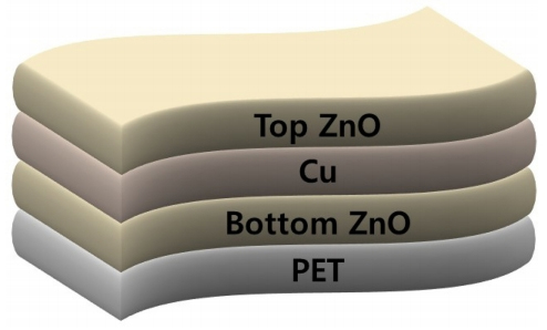 유연 광전소자 적용을 목표로 하여 PET 기판상에 멀티 타겟 마그네트론 스퍼터 시스템을 이용하여 진공을 유지한 상태에서 ZnO/Cu/ZnO 복합 코팅층을