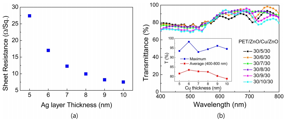 (a) Optical transmittance of ZnO/Cu/ZnO transparent electrodes fabricated on PET substrate
