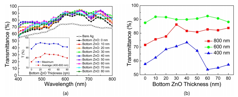 그림 3(a)는 상부 ZnO층과 Cu층의 두께를 각각 30 nm와 8 nm로 고정한 채 하부 ZnO층의 두께를 0-80 nm까지 변화시키며 증착한 ZnO/Cu/ZnO