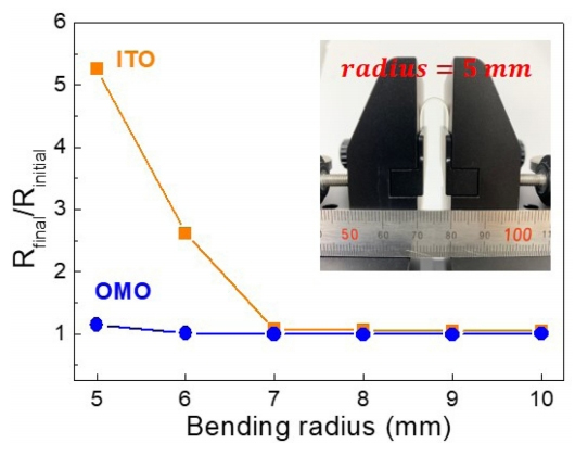 전극에 대한 굽힘 시험(Bending test)의 결과를 보여준다. 굽힘 반경이 7 mm가 될 때까지는 두 종류의 전극 모두 면저항의 변화가 관찰되지