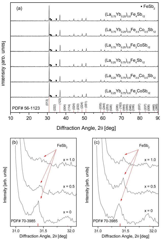 XRD patterns of (a) the (La1−zYbz)0.8Fe4−xCoxSb12 skutterudites and enlarged patterns of the specimens with (b) z = 0.25 and (c) z