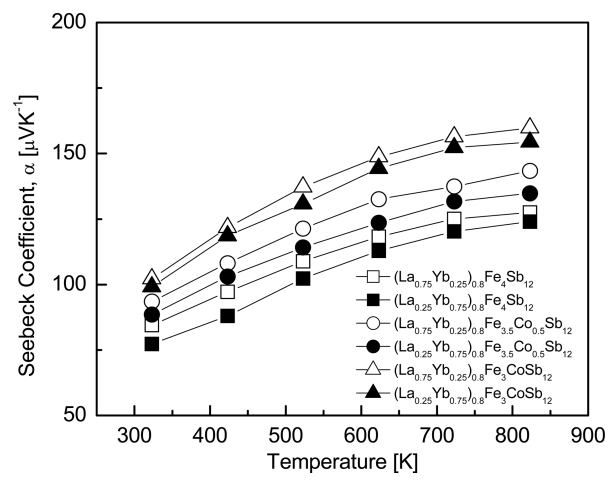 and the enhanced charge compensation by Co. (La0.75Yb0.25)0.8Fe3CoSb12 yielded the highest Seebeck coefficient of 159.7 μVK-1 at 823 K, and the fully-filled La0.75Yb0.25Fe3CoSb12 exhibited a maximum Seebeck coefficient of 175.5 μVK-1 at 723 K [20]. Thus, the partially-filled specimens showed lower Seebeck coefficient values than