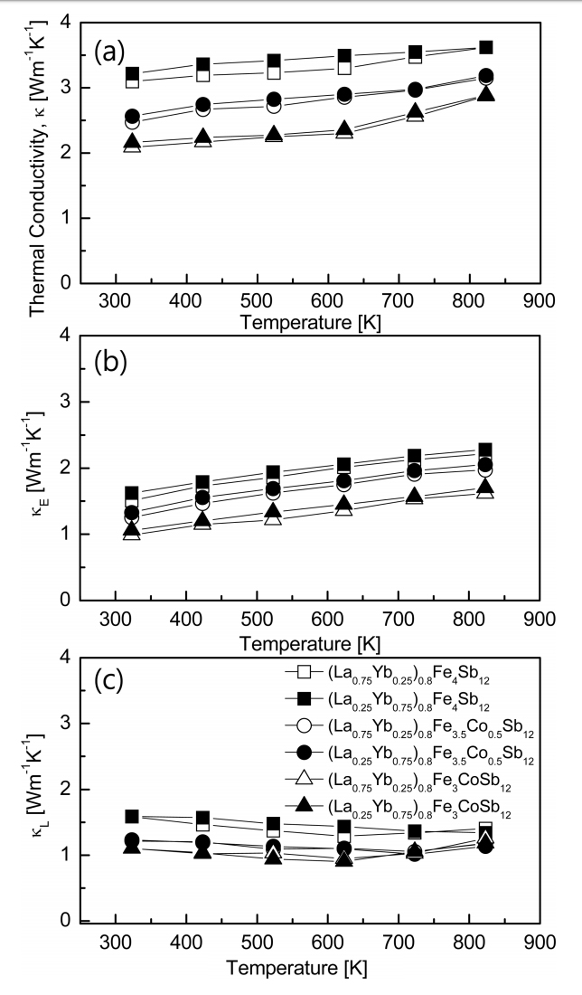 Temperature dependence of the thermal conductivity for (La1−zYbz)0.8Fe4−xCoxSb12: (a) total thermal conductivity, (b) electronic thermal conductivity, and (c) lattice