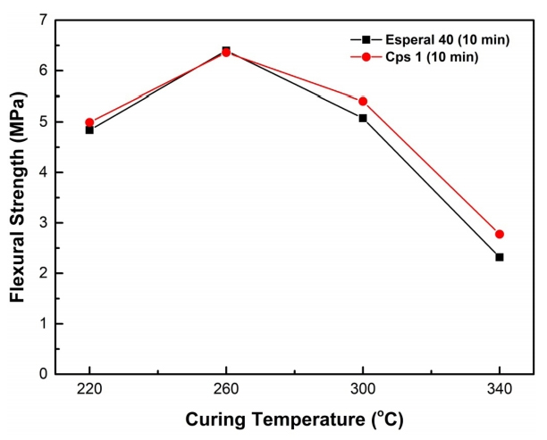그림 13은 경화 시간에 따른 인공사 Esperal 40, Cps 1에 코팅된 CBAPC_4.5로 제조된 시험편의 항절 강도 분석 결과를 나타냈다. Esperal 40, Cps 1은 260 oC에서 10분 경화 시 최대 강도 6.40, 6.36 MPa를 나타냈다. 경화시간이 5분에서 7분으로 경과함에 따라 CBAPC_4.5 내 존재하는 많은 함량의 인산을 증발시키기 위한 건조 시간이 부족하여 시험편의 제조가 어려운 경향을 관찰하였다. 경화 시간이 10분에서 15분으로