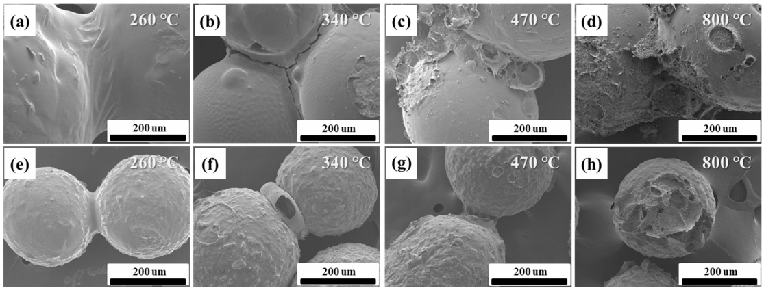 그림 12는 경화 온도에 따른 인공사 Esperal 40, Cps 1에 코팅된 CBAPC_4.5로 제조된 시험편의 FE-SEM 분석을 나타냈다. 260 oC에서 경화된 시험편은 CBAPC_4.5가 인공사 입자 표면에 균일하게 코팅되었으며, 인공사 입자 사이를 연결하는 구조체의 가교 결합 (bonding bridges)은 매끄럽고 조밀한 구조를