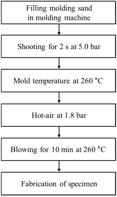 CBAPC 바인더의 강도 및 조형 특성을 확인하기 위해 그림 2와 같이 시험 중자를 제조하였다. 금형 및 열풍 온도는 260 oC, 주물사의 충진을 위한 슛팅 압력 5.0 bar, 열풍 압력 1.8 bar, 경화 시간 10분 조건으로 경화하였다. 그림 3은 위의 조건으로 시험편 (Length×Height×Width: 170×20×20 mm)을 제조하였다. 모든 시험편은 동일한 환경 (온도: 13 ±