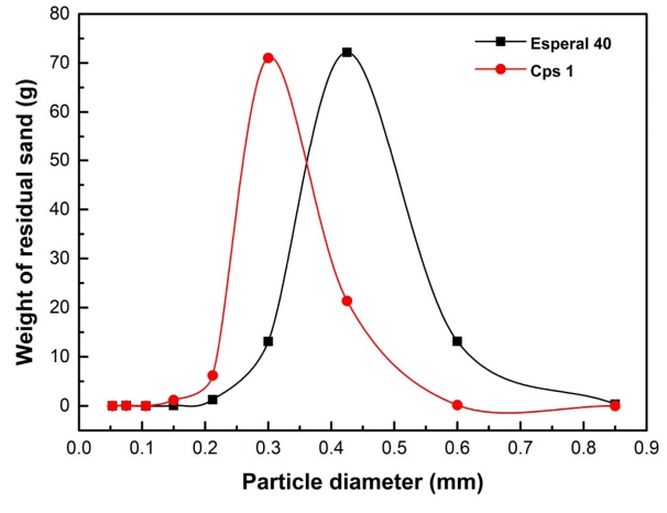 좁은 원뿔 모양으로 나타났다. 인공사 Esperal 40, Cps 1의 AFS GFN (american foundry society grain fineness