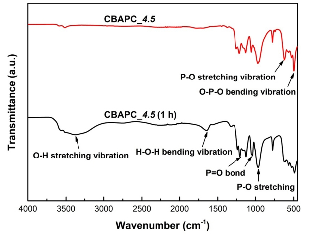 CBAPC_4.5의 화학적 구조와 내습성에 미치는 영향을 확인하기 위해 FT-IR 분석을 실시하였다. 흡습 전과 후의 CBAPC_4.5의 FT-IR 스펙트럼을 그림 8에 나타냈다. 1시간 노출 (온도: 20 oC, 상대습도: 30%) 후 CBAPC_4.5 (1 h)의 여러 흡수 피크가 관찰되었으며, CBAPC_4.5의 노출 시간이 경과함에 따라 3400 cm-1에서 물 분자의 OH 신축 진동 (stretching vibration)에 의해 넓고 강한 피크를 확인하였다. 분자 내 존재하는 OH기의 신축 진동
