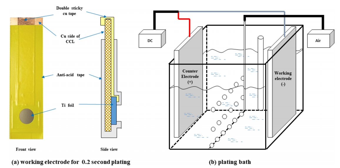 초기 핵생성 관찰용 샘플 제조를 위하여 20 mm × 20 mm 크기에서 1 cm2 면적이 노출되도록 하였고, 인장시험 샘플 제조를 위하여 50 mm × 150 mm 크기로 각각 다르게 제작하였다(그림 1). 극간 거리는 10 cm로 일정하게 유지하며 전류밀도 20 ASD 정전류 모드로 도금을 실시하였으며, 이 과정동안 도금액의 온도는 50 ℃(±0.5