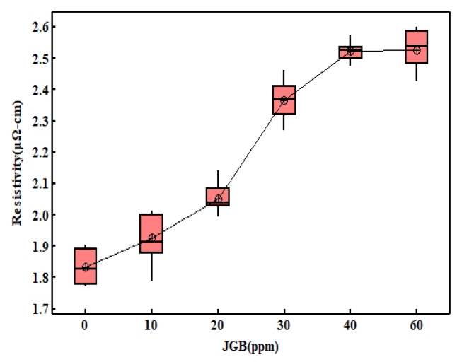 0 ~ 40 ppm까지 증가하는 동안에는 선형회귀 근사식에서 R2 값이 91.4 %로 JGB 농도에 비례하여 비저항이 증가하는 것을 알 수 있으며, 40 ~ 60 ppm 구간에서는 유의차가 없었다. 도금과정에서