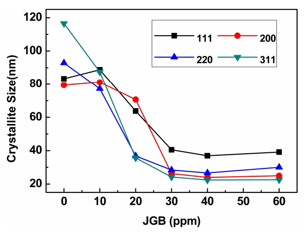 2. JGB 첨가제는 초기 핵생성과정에서 결정성장을 억제하고 핵생성을 촉진하여 표면에너지가 높은 (220) 방위로의 결정성을 촉진하고, 결정립 크기의