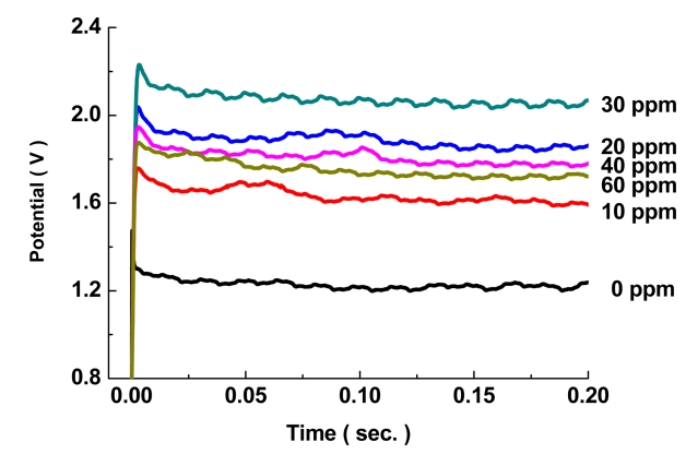 그림 2에서 JGB 첨가량을 0 ~ 60 ppm 첨가하여 초기 전압을 측정하였을 때, 무첨가군 대비 JGB 첨가군들에서 전체적으로 전압이 높게 나타나고 있다.