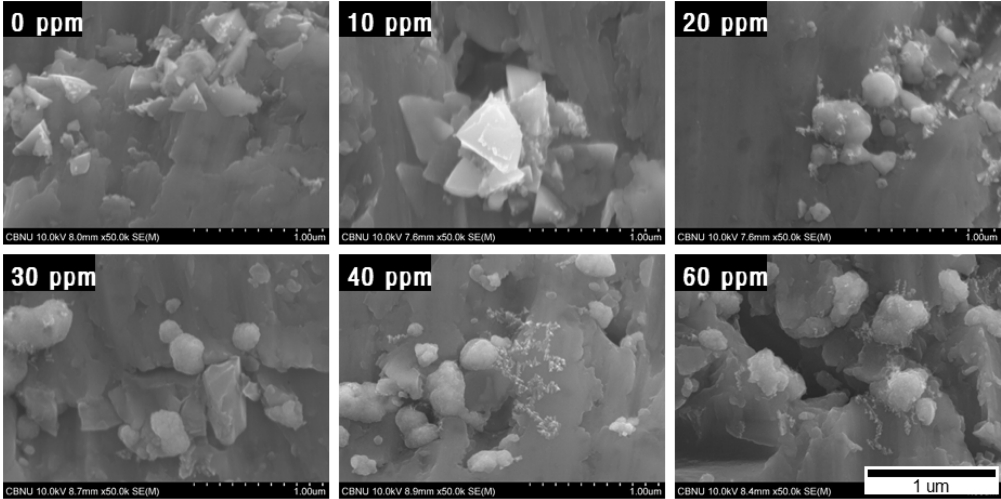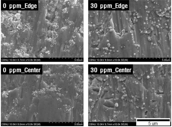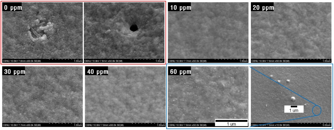 확인할 수 있다. 이러한 현상은 60 ppm 첨가한 표면에서 확연하게 나타나고 있으며 일부 표면에서는 1 µm 이상의 돌기가 표면에 돌출되어 있다.