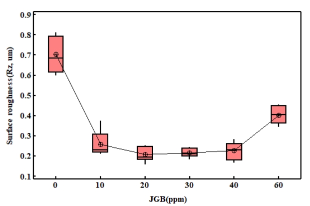 값이 0.134로 표면거칠기 상의 유의차가 없다. JGB 첨가제를 60 ppm 첨가한 경우에는 표면에 돌기 등의 발생으로 측정장비의 오류가 발생하여