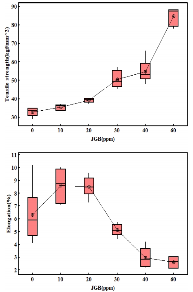 인장강도의 경우 첨가량 증가에 따라 지속적으로 증가한 반면 연신율은 무첨가군 대비 10 ~ 20 ppm JGB를 첨가한 경우에 증가양상을 보인 후