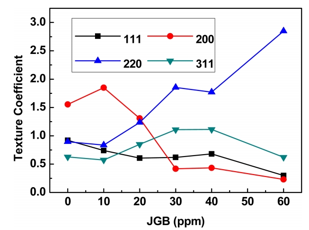 JGB 평활제 첨가로 전착층 표면에서 결정들이 성장하는 것을 억제하여 결정립 크기를 감소시켰고 (311), (220) 집합조직에서의 감소 현상이 두드러지게