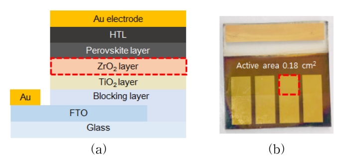 본 연구에서는 ZrO2 층의 두께에 따른 PSC의 광전기적 특성을 확인하기 위해 그림 1 (a)에 나타낸 바와 같이 glass/FTO/BL-TiO2/(Meso-TiO2/ZrO2)/perovskite/HTL/Au electrode 구조의 소자를 제작하였으며, (b)에 최종적으로 제작한 소자의 실제 모습을 나타내었다.