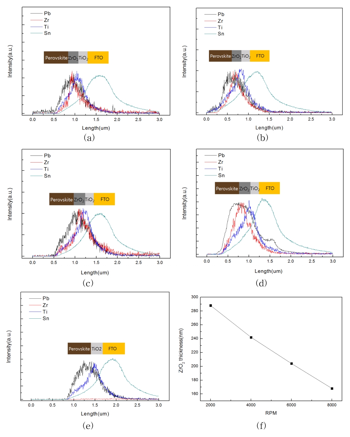 그림 2에는 EPMA를 이용하여 glass/FTO/BL-TiO2/TiO2/ZrO2/perovskite 구조 시편의 RPM 조건에 따른 ZrO2 층 두께 분석 결과를 나타내었다. 이때 8000, 6000, 4000, 2000 RPM 조건으로 ZrO2 층을 제작하였으며, 각 층에 대하여 Sn, Ti, Zr, Pb를 선택하여 분석하였다.