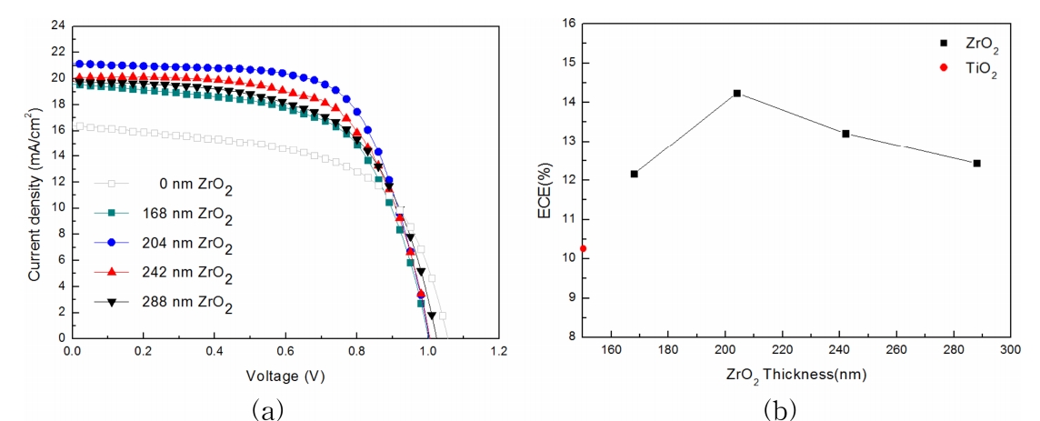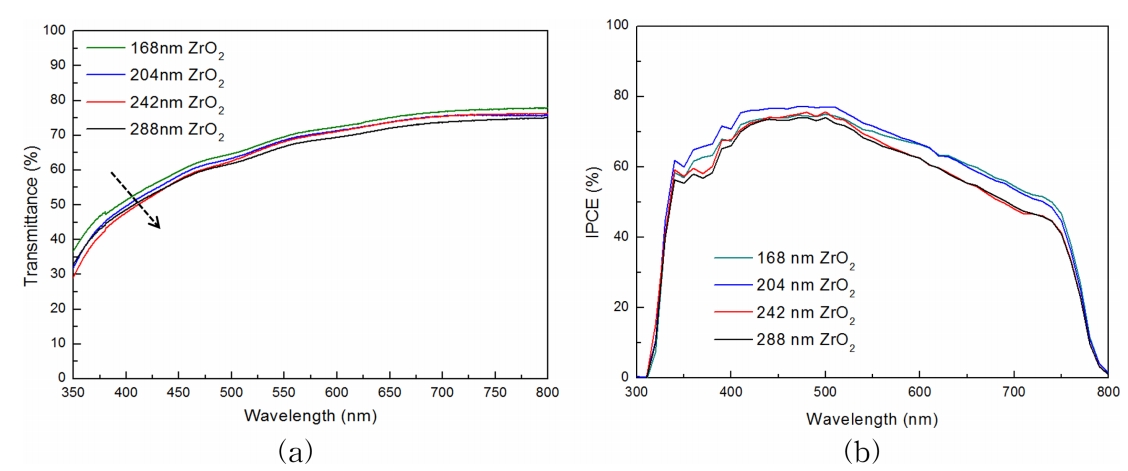 따라서, ZrO2 층의 두께가 과도하게 증가하면 투과도 특성이 감소하여 에너지변환효율에 부정적인 영향을 미치고, 결국 앞서 보인 ZrO2 층의 전도도 향상에 의한 긍정적인 특성을 고려한 204 nm ZrO2 층이 채용되었을 때, 가장 우수한 에너지변환효율을 나타내는 것으로 판단하였다.