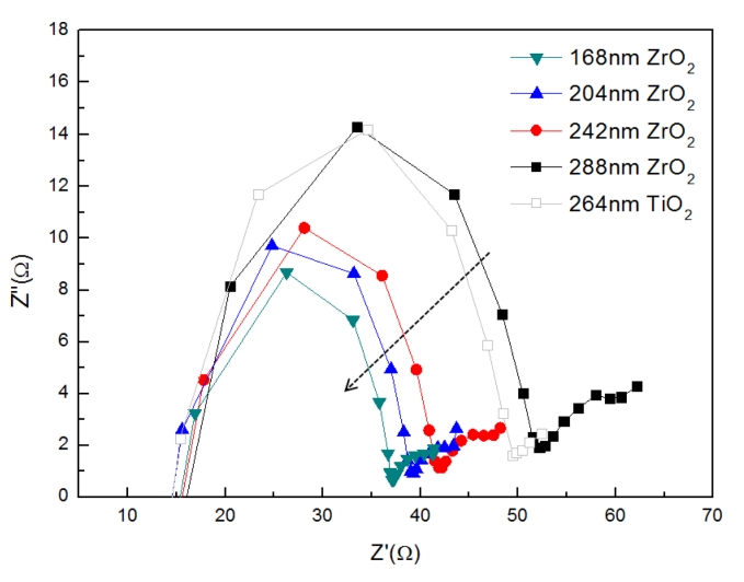 ZrO2는 기존의 TiO2 보다 자체 저항이 낮아 전자전달효율이 우수할 것으로 예상되어 전체 소자의 에너지변환효율 증가가 예상되나 이에 대한 정량적인 물성 연구는 아직 보고된
