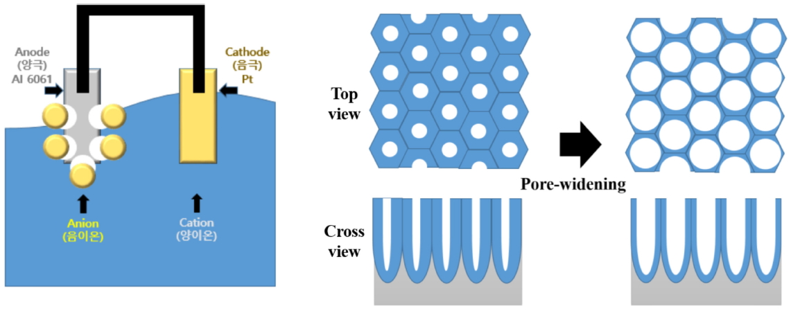 50분까지 10분단위로 단계적으로 진행하고, 2차양극산화 같은 조건인 40 V 정전압을 인가하여 30분동안 3차 양극 산화를 진행하였다. 그림 1은 양극산화 공정과 Pore-widening 모식도이다. 양극 산화 후 생성된 알루미늄 6061 합금 표면의 산화피막 관찰을 위해 전계 방사형 주사전자현미경(Field