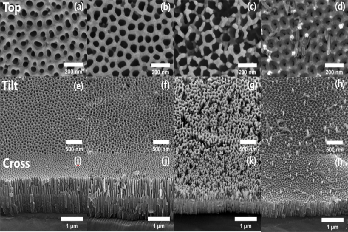 2차 양극산화 후 수행되는 PW 공정은 2차 양극산화 시 생성되는 구조물의 형상에 큰 영향을 미친다. Cross-section 이미지를 통해 알 수