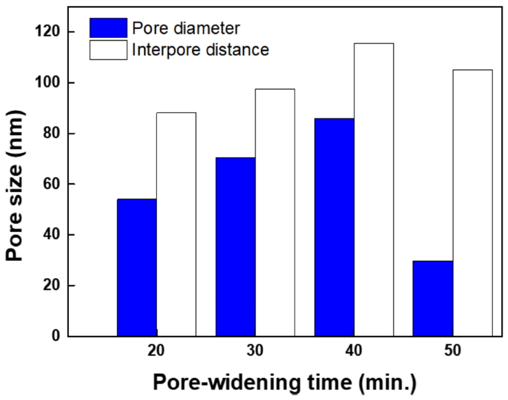 Variation of pore diameter and interpore distance according to pore-widening time.