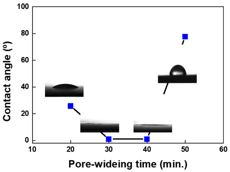 Contact angle measurement on the under anodization by modulating pore-widening time.