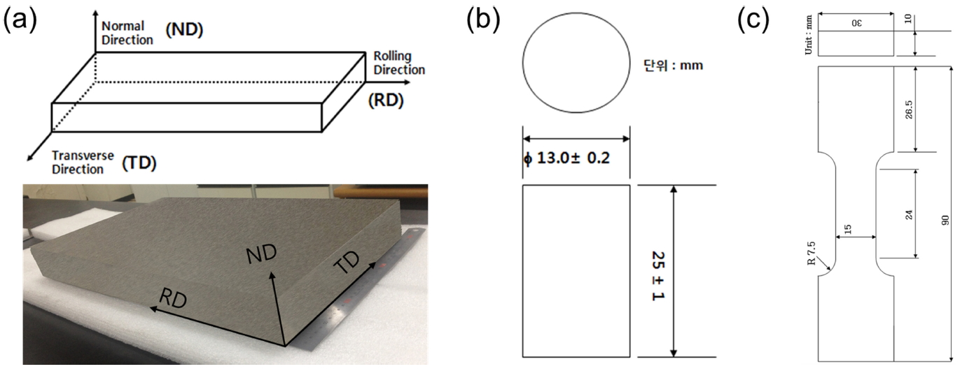 ์ฌ์ฉํ์์ผ๋ฉฐ, MTS 810 ์ฅ๋น๋ก ์ด๊ธฐ ๋ณํ๋ฅ ์๋(strain rate) 10-4/s, ์ต๋ ์์ถ ๋ณํ๋ฅ ์ 60%๋ก ์ค์ ํ์ฌ ์งํํ์๋ค. ์ธ์ฅ ์คํ์ ์ํ์ฌ ๊ฒ์ด์ง 15 mm (W) ร 10 mm (T) ร 24 mm (L) ํฌ๊ธฐ์