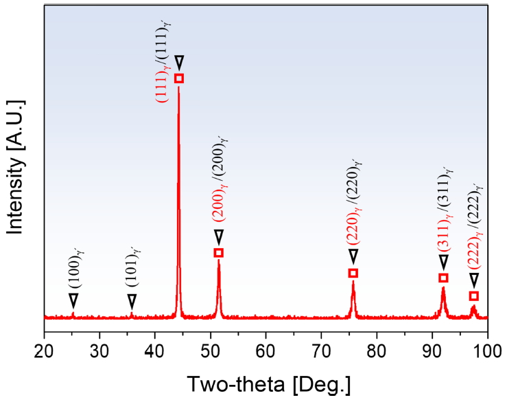 (2) ๋ธ๋ก Ni-Cr-Al ๋ค๊ณต์ฒด๋ ฮณ (Ni-based matrix)์ ฮณโ (Ni3Al) ์๋ค๋ก ๊ตฌ์ฑ๋์ด ์์๋ค. ฮณโ์์ ๋ถ์จ์ 60.7%, ํ๊ท ํฌ๊ธฐ๋ 0.943 ฮผm, ์ต๋ ํฌ๊ธฐ๋ 3.985 ฮผm, ์ต์ ํฌ๊ธฐ๋ 0.112 ฮผm๋ก