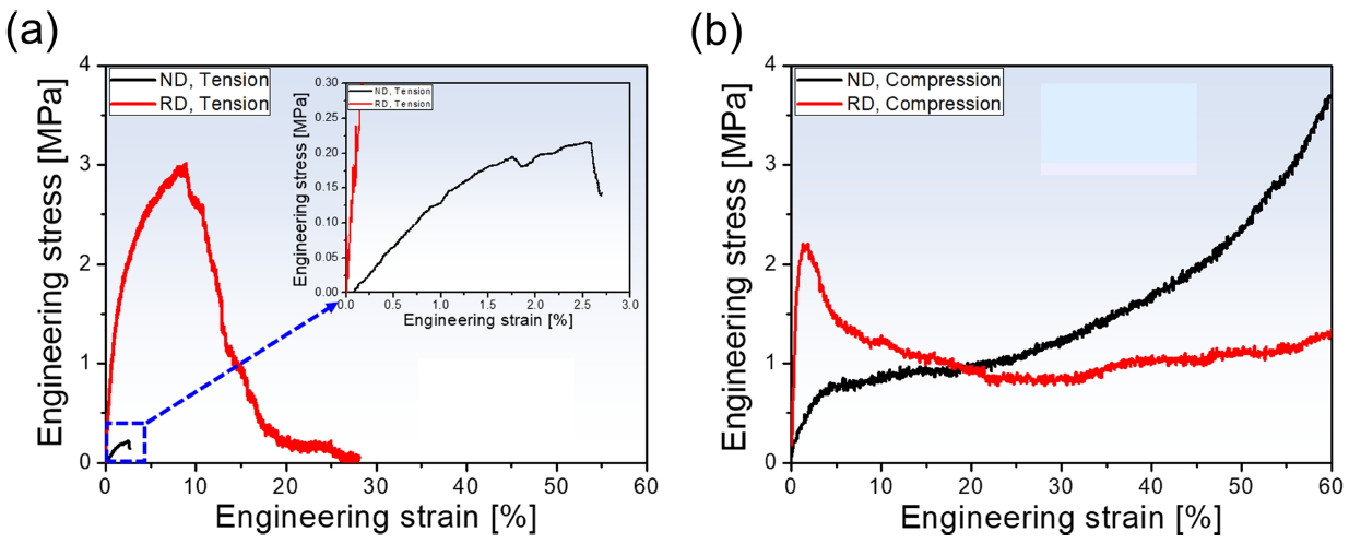 1.27 MPa์ ํญ๋ณต ๊ฐ๋, 3.01 MPa์ ์ธ์ฅ ๊ฐ๋, 8.92%์ ์ฐ์ ์จ์ ๊ฐ์ง๋ ๊ฒ์ผ๋ก ๊ด์ฐฐ๋์๋ค. ND ๋ฐฉํฅ์ผ๋ก ์์ถ์ ํ ๊ฒฝ์ฐ์๋ 0.795
