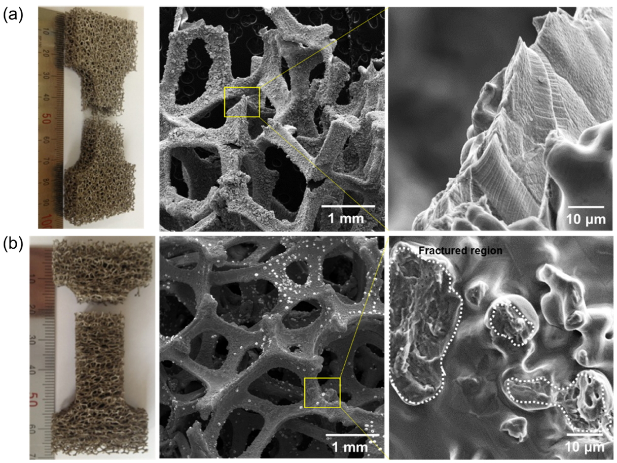 Ni-Cr-Al ๋ธ๋ก ๋ค๊ณต์ฒด์ ๊ฒฝ์ฐ, ๋ค๋ฅธ ๊ณต์ ์ผ๋ก ์ ์กฐ๋ ๋ค๊ณต์ฒด ๋ณด๋ค ์์ ์ ์ธ ๊ธฐ๊ณ์ ํน์ฑ(์๋ ฅ ๊ฐ์๊ฐ ํฌ๊ฒ ์๋)์ ๋ํ๋ผ ๊ฒ์ผ๋ก ํ๋จ๋๋ ๊ฒฐ๊ณผ์ด๋ค.